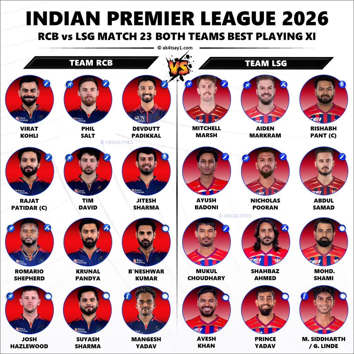 Thanks for reading! What’s your best playing 11 for the RCB vs LSG Match 23 of the Indian Premier League (IPL) 2026? Please email your thoughts to business@cricalytics.com